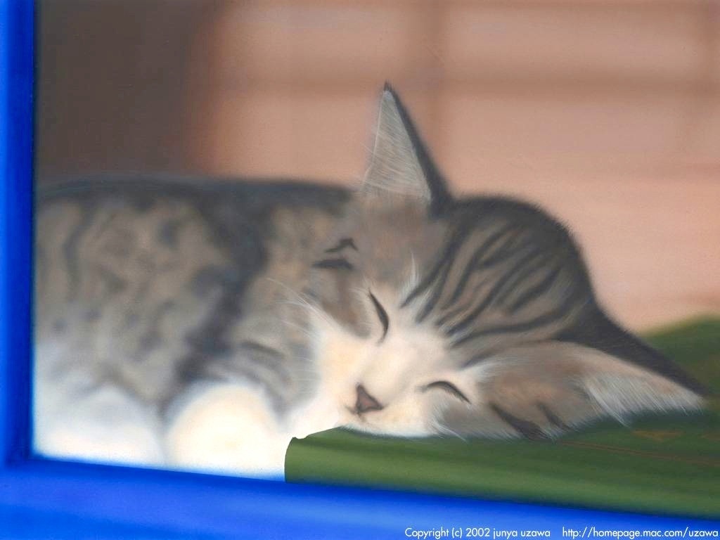 こねこシリーズ第二弾です。この頃はメインの動物だけじゃなく、背景の物の質感にもこだわっていろいろ模索していました。Web上だとわからないのですが、コネコの枕(?)になってる本(アルバム)はちゃんと布の模様まで描きこんでいました。