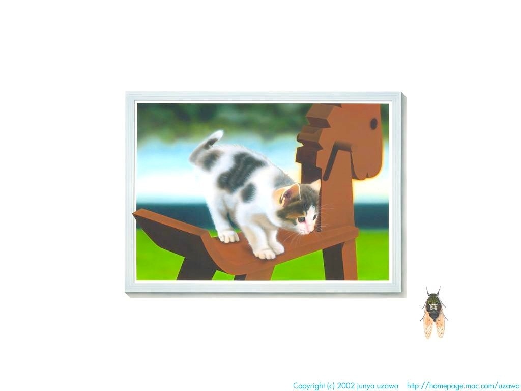 今回も『トリックアート』になっています。今回のはコネコが乗っている木馬が、額縁からちょっとはみだしているのがポイントです。「なんだ、あいつ。」は当然、右下の『みんみんぜみ』を指しています。虫ならなんでもよかったのですが、時期が夏なのでセミにしました。『みんみんぜみ』を選んだのは『あぶらゼミ』だったらよく見かけることがありますが、『みんみんぜみ』だとちょっとめずらしいからってゆうのと、『あぶらゼミ』より『みんみんぜみ』のほうが色的にキレイだからです。 |