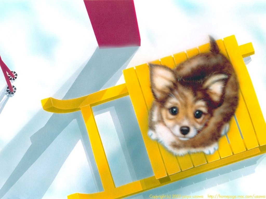 そして、考え出されたのがコレ、ソリにのって「はやく滑ろうよ!」ってサイソクしているワンコを描いてみました。