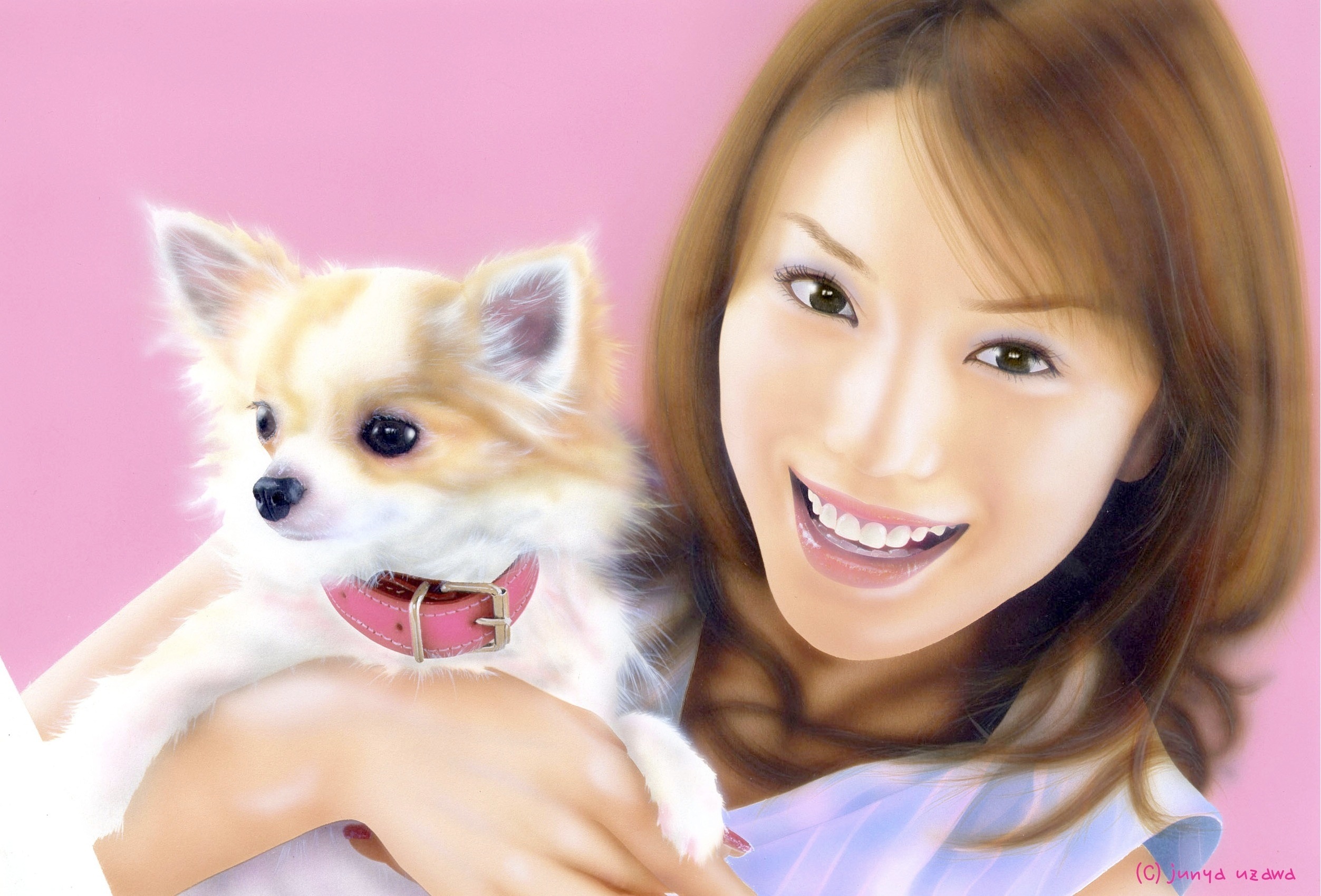 チョー久しぶりの人物画です!!しかも、今大人気のエビちゃん!!まだあまり人物画を描きなれてないのにこんなメジャーな人物を描いていいものかと迷いましたが、ファンだし、好きならウマく描けるだろうと思いチャレンジしました。しかもワンコもいるのでそれ相応の覚悟はしていましたが、案の定、タイヘンでした。時間も前作(sakura)の2倍以上かかってます。女性を描いたのは、なんと4年ぶりでした。