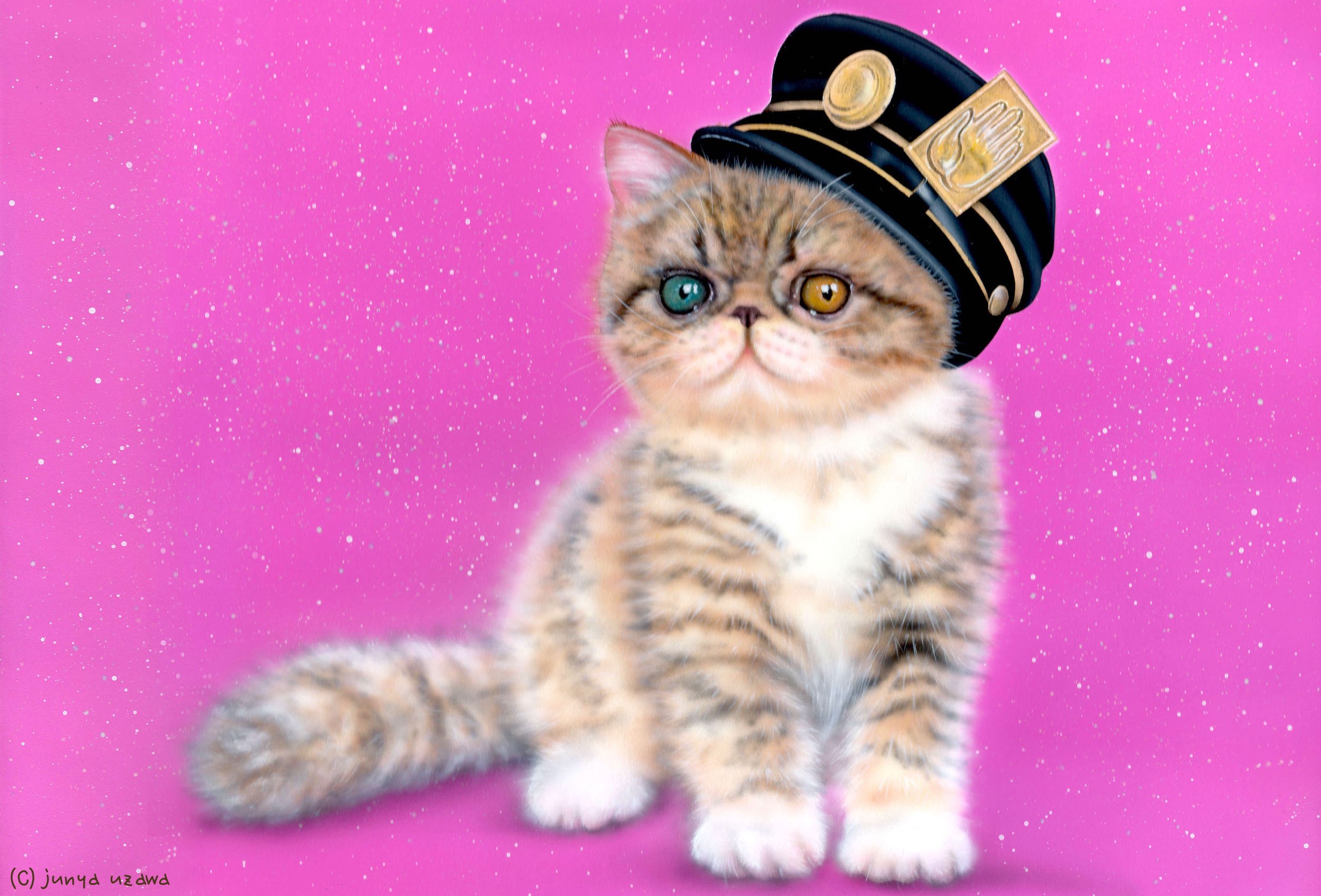 はじめて描いたエキゾチックは駅長チックでした… 前作につづき、まえから描いてほしいと言われてた種類の「エキゾチックショートヘア」です。ひねくれものの私は、ただエキゾチックショートヘアを描くのでは納得いかないので、こうなりました。以前から温めていたネタではなく、突如思い浮かんだものでした。シンプルにかわいい猫じゃなくこういう「ぶちゃカワ系」の猫もたまに描くのは楽しいですね。 駅長ではなく、あくまで「駅長チック」なだけなんです。